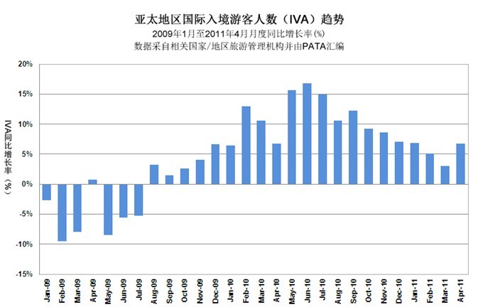 4月的数据显示,2011月1-4月,亚太地区国际入境游客总数较去年同期增加550万人次,同比增长5.4%。