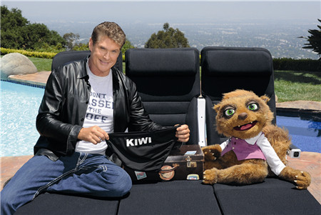 图为Rico与大卫·哈塞尔霍夫(David Hasselhoff)在Skycouch上合影