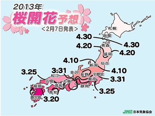 据日本气象协会预测:2013年樱花(染井吉野樱)的开花日期,九州、四国、中国、近畿、东海地区比往年早些或者与往年同期开花。关东、北陆地区、甲信、东北地区和北海道的花期与往年持平。