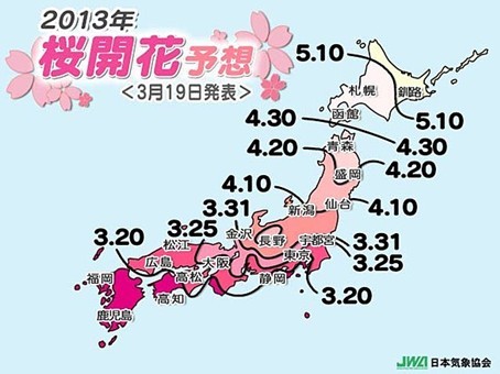 2013年的樱花开花日,从九州到四国地区以及东京都周边比往年早10天左右,有些地方还会创下早开的记录吧。今后中国地区到关东地区的樱花的开花日,要比往年早3天到一周的样子。甲信、北陆以及东北地区的多数地区比往年早开2~4天,北海道基本与往年同期。九州各地、东京都的周边等,早的地方这周末可以欣赏到绽放的樱花。关东以西的多数地区3月最后的周六日可以赏樱花了。