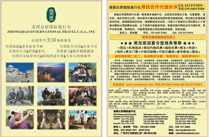 美国众侨国际旅行社是一家美国本地旅行社,总部设在美国休士顿,在夏威夷、洛杉矶、纽约均有分公司,有20多年丰富的美国组团和美国地接经验,同时我们还是美国航空协会,国际航空协会,美国邮轮协会会员,代理几十家航空公司机票及几十家豪华邮轮公司船票的业务,为了拓展中美旅游市场,希望在国内寻找合作代理伙伴,条件非常优惠,免费培训,可邀请到美国公司总部参观考察,欢迎加盟.