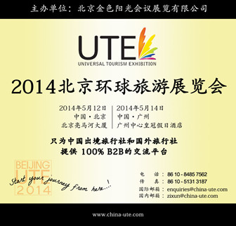 2014北京环球旅游展览会(简称“UTE”)春季展为巡展。展览会共两天,将分别在北京和广州举行。5月12日的展览在北京亮马河大厦酒店举行,5月14日的展览在广州皇冠假日酒店举行。
