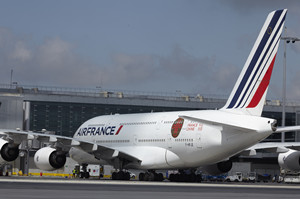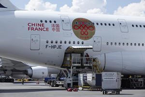 2014年5月26日,北京 —— 为纪念中法建交50周年,从五月初至2014年年底,执飞法航长途航线的有一架特别装饰的A380客机,机身印着象征中法友谊的红色图案。该飞机于5月6日首次降落在上海。