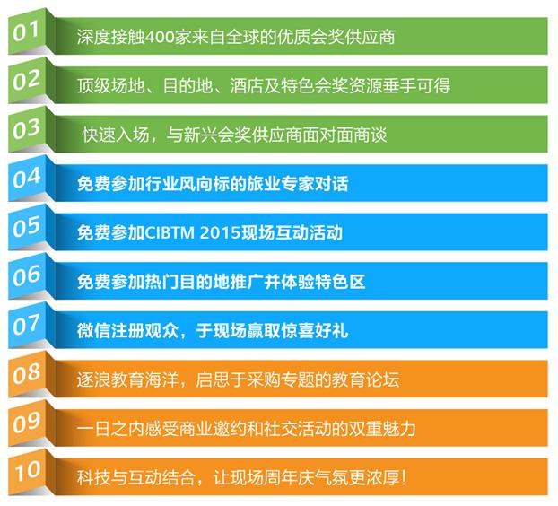CIBTM将于两天展期内以最经济、高效的商业模式为买卖双方提供直面潜在客户、拓展商业资源、巩固联系的一站式商业平台。在这里,您还能通过专业教育论坛和各色社交活动把握行业脉动、抢滩会奖资讯并助力业务延展。