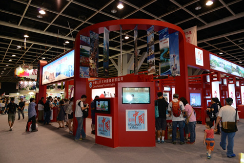 (A) 中国馆(逾80个展位)包括北京、天津、山西、江苏、福建、桂林、重庆、四川、云南、陕西西安、陕西韩城市、青海和新疆维吾尔族自治区,另外还有广东省市包括东莞、深圳、佛山、江门、南海、清远、韶关、中山、珠海等旅游局连同旅行社、酒店、景区展出。