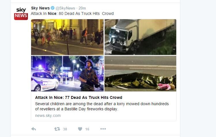 [环球网报道 记者 王莉兰]法国当地时间7月14日晚间,一辆卡车冲进正在观看国庆日烟花表演的人群,已造成逾80人死亡,上百人受伤。当地市政府称这是一起恐怖袭击,并要求居民待在家中。