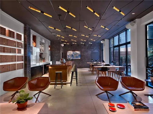 公共空间的设计是 Arlo 酒店的一大亮点。黄铜色和黑色的金属、深色的木材,再加上玻璃和有着温暖质感的灰色布料,以及偶然出现的深蓝色和绿植。整个酒店在内部装潢上以这样较为保守的颜色为主调,通过不同材质的混搭,呈现出精致而又不失沉稳的风格。