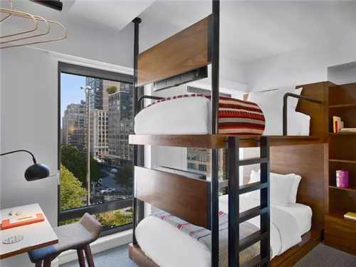 可以看到,在 Arlo 提供的 325 个房间里,几乎每个房间都有着超大的窗户,从这里可以欣赏绝妙的纽约市景。有的房间配备了双层床,这种带有双层床的房间面积为 13.9 平米,也最便宜,打折的时候每晚 800 多人民币就可以住到。它还配备了大露台的双床间,面积是最大的,但也不过 15.3 平米。