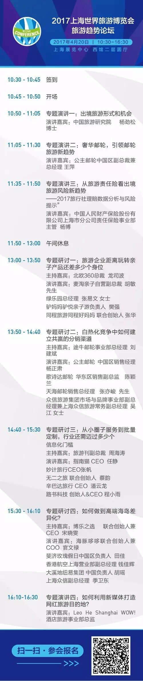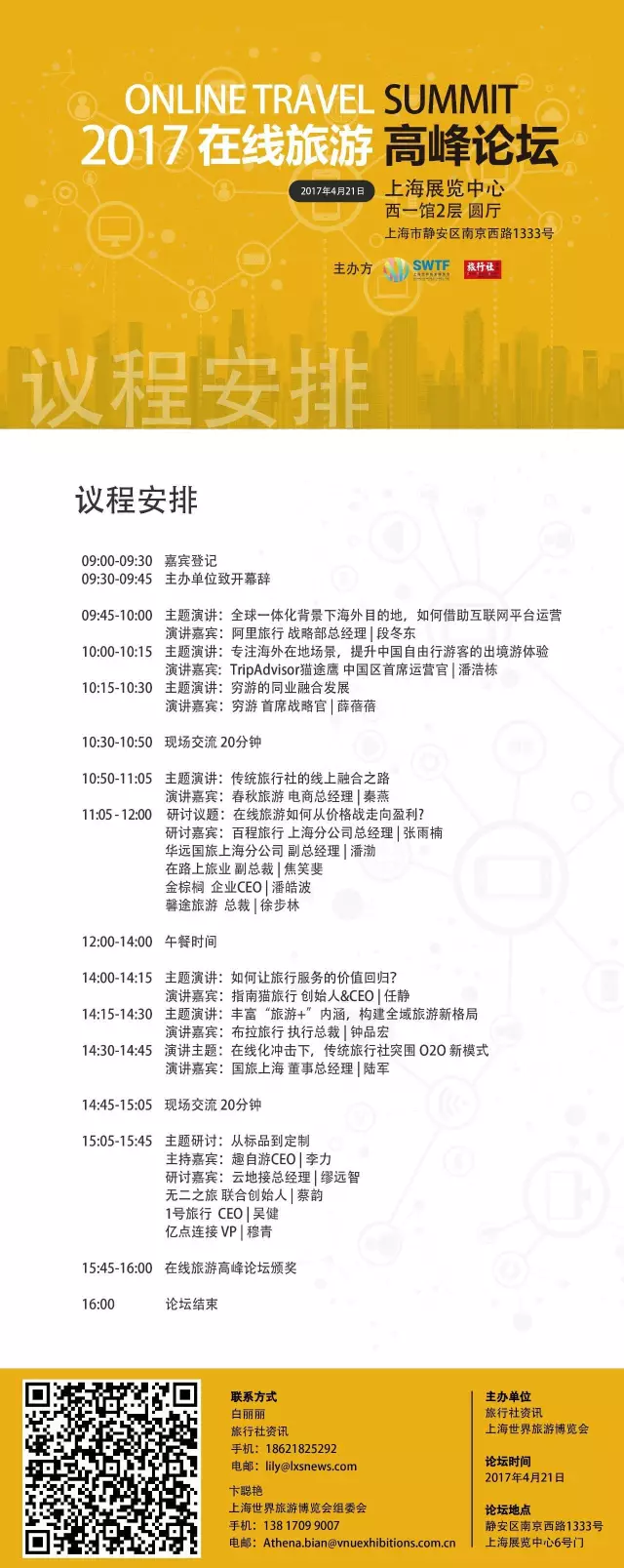 今年展会同期将举办两场会议活动,分别是4月20日的SWTF旅游趋势论坛和4月21日的上海在线旅游高峰论坛。