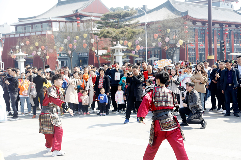 3月16日下午,大雁塔南广场玄奘像前,来此参观游玩的市民游客络绎不绝,突然响起的音乐和两位“大唐武士”的出现,吸引了众人的目光……
