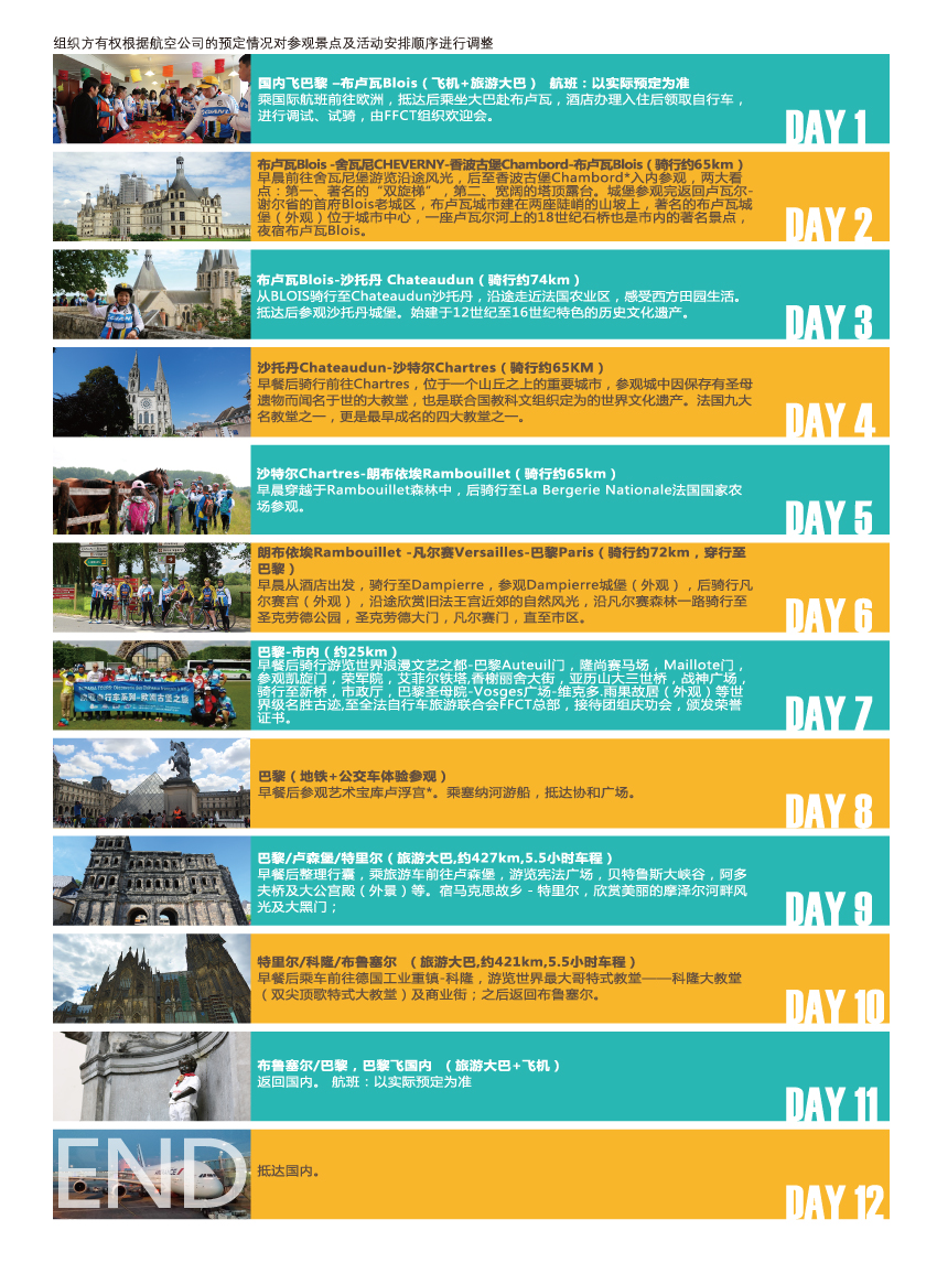 介绍: 组织单位:欧中友好协会(AssociationAmitiéEuro-Chinoise简称:AAEC) 北京欧亚友好国际旅行社(全法自行车旅游联合会授权中国地区独家代理单位) 承接单位:法国欧亚旅行社(EurasiaTours) 支持单位:全法自行车旅游联合会(FédérationFran?aisedeCyclotourisme简称:FFCT) 活动时间:组织方有权依据实际情况对出行日期做调整。 淡季发团时间:3.28、10.21 旺季发团时间:5.20、6.17、9.02、9.16 参团价格:淡季17800人民币/人旺季18800人民币/人 团组人数:25人起 旅游国家:法国、比利时、德国、卢森堡 活动亮点: -法国全国自行车旅游联合会支持,中法骑友交流, -法国资深骑手领骑,交流骑行技巧; -法国FFCT官方庆祝活动,颁发纪念意义的骑行证书 -成为法国FFCT年度会员 -领略巴黎经典文化,体验法国深度骑行路线 -探寻神秘的卢瓦尔河谷城堡群 -绿色出游、低碳环保、休闲度假 费用包含: 1.骑行期间:FFCT提供专业骑行保险,中法骑友交流活动,庆功西式晚餐,1辆自行车的使用权;正餐(中式六菜一汤或西式快餐);住宿(含早餐);1名外国专业领骑、1名中文导游;景点门票(巴黎卢浮宫,塞纳河游船,香博堡);箱式后勤货车1辆; 2.旅游期间:住宿(含早餐);正餐:中式6菜一汤;1名中文导游、1名外籍专业司机;旅游巴士; 3.全程往返国际机票及机票税; 4.法国签证费用、签证服务费、境外旅游保险; 费用不包含:全程小费66欧元/人;单房差(如产生):2500人民币/人;个人消费,国内交通费;因人力不可抗拒因素导致的费用增加;报价未包含的景点门票和其它费用; 联系方式: 电话:010-68002462,68001171 邮箱:op^^befit.com.cn info^^aaecf.com QQ:1273541595 3114177085 官网:欧中友好协会www.aaecf.com 法国欧亚旅行社www.eurasiatours.cn 北京欧亚友好国际旅行社www.befit.com.cn