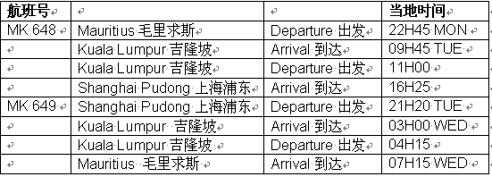毛里求斯航空今天宣布于2011年7月初开通至中国上海的直航航线。上海因此将成为毛里求斯国家航空的第25个航点及东亚的第4个航点。毛里求斯航空目前已飞往新加坡、马来西亚和香港。