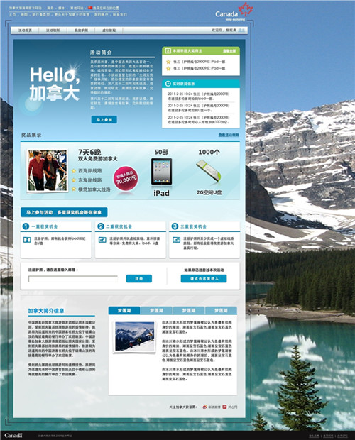 “Hello, Canada”宣传活动第一阶段为期三个月,启用立体叠加的媒体沟通渠道,除了在传统平面媒体上进行投放外,还整合搜索引擎优化、社区互动、电子杂志、视频电影、社交网站、博文发表等多样新兴传播方式,用仿佛介绍一位新朋友的口吻向中国游客引荐加拿大这一四季皆宜的旅游胜地。此外,为了更好地激发中国游客对加拿大的好奇心,活动还推出一款有奖在线游戏,幸运者能获得畅游加拿大的机会,还有可能赢取ipad大奖。欲知详情,可登录页http://hello.canada.travel